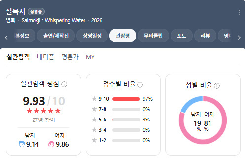 영화진흥위원회 영화관입장권 통합전산망에 따르면 8일 오전 8시 10분 기준, 영화 '살목지'는 전체 예매율 27.9%로 1위를 기록 중이다. 사전 예매 관객 수는 7만 6502명에 달한다. 여기에 같은 날 오전 12시 기준 네이버 영화 실관람객 평점은 무려 9.93점으로 개봉 첫날부터 관람객들의 호평이 쏟아졌다.