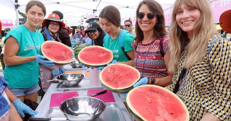 외국인 참가자들이 직접 수박을 손질하며 화채를 준비하는 모습으로, 한국 전통 여름 디저트를 체험하며 즐거워하는 글로벌 문화 교류 현장을 담은 이미지. / 뉴스1