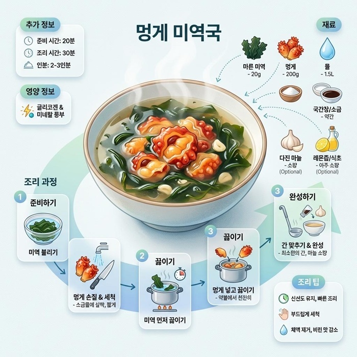 조리 방법도 비교적 간단하다. 먼저 마른 미역을 물에 불린 뒤 깨끗이 씻어 준비한다. 멍게는 껍질을 제거한 뒤 먹기 좋은 크기로 손질하고, 혹시 남아 있을 수 있는 이물질을 가볍게 헹궈준다. 이때 너무 오래 씻으면 멍게 특유의 향이 빠질 수 있으므로 짧게 처리하는 것이 좋다.