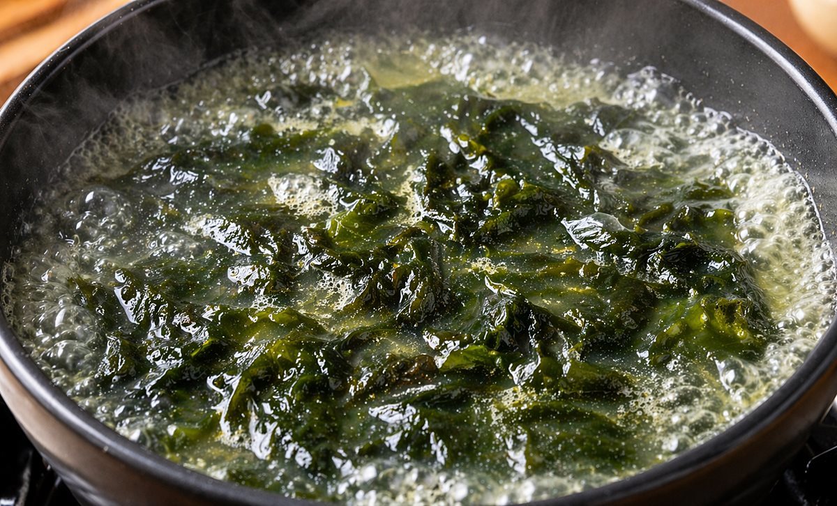 이 과정은 미역의 비린 향을 줄이고 고소한 맛을 끌어내는 중요한 단계이다. 이후 준비한 보리새우를 넣고 함께 볶아 주면 보리새우가 기름과 어우러지며 더욱 고소한 향을 내고 국물의 풍미를 살려준다. 이어서 물을 붓고 끓이기 시작하면 보리새우에서 우러난 감칠맛이 서서히 퍼지면서 깊고 시원한 국물이 완성된다.