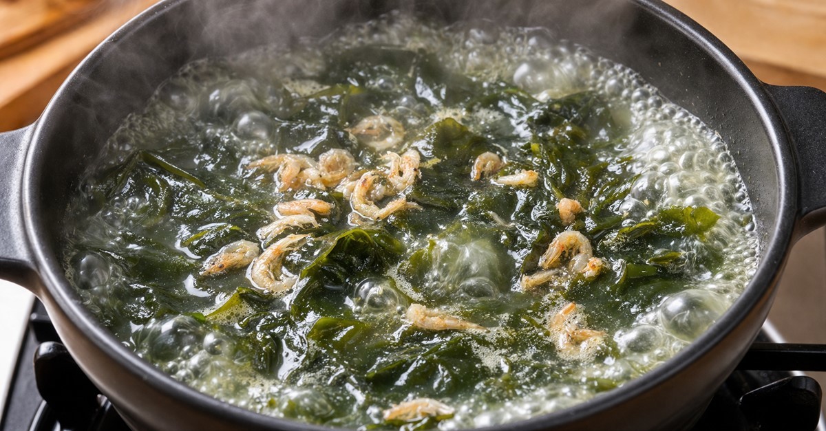 국물이 끓어오르면 중약불로 줄여 충분히 끓여 주는 것이 좋다. 이 과정에서 미역은 더욱 부드러워지고 보리새우의 풍미는 국물 전체에 고르게 배어든다. 간은 국간장이나 소금을 사용해 맞추되 보리새우 자체에도 약간의 짠맛이 있으므로 처음부터 강하게 간을 하기보다는 조금씩 조절하는 것이 바람직하다.