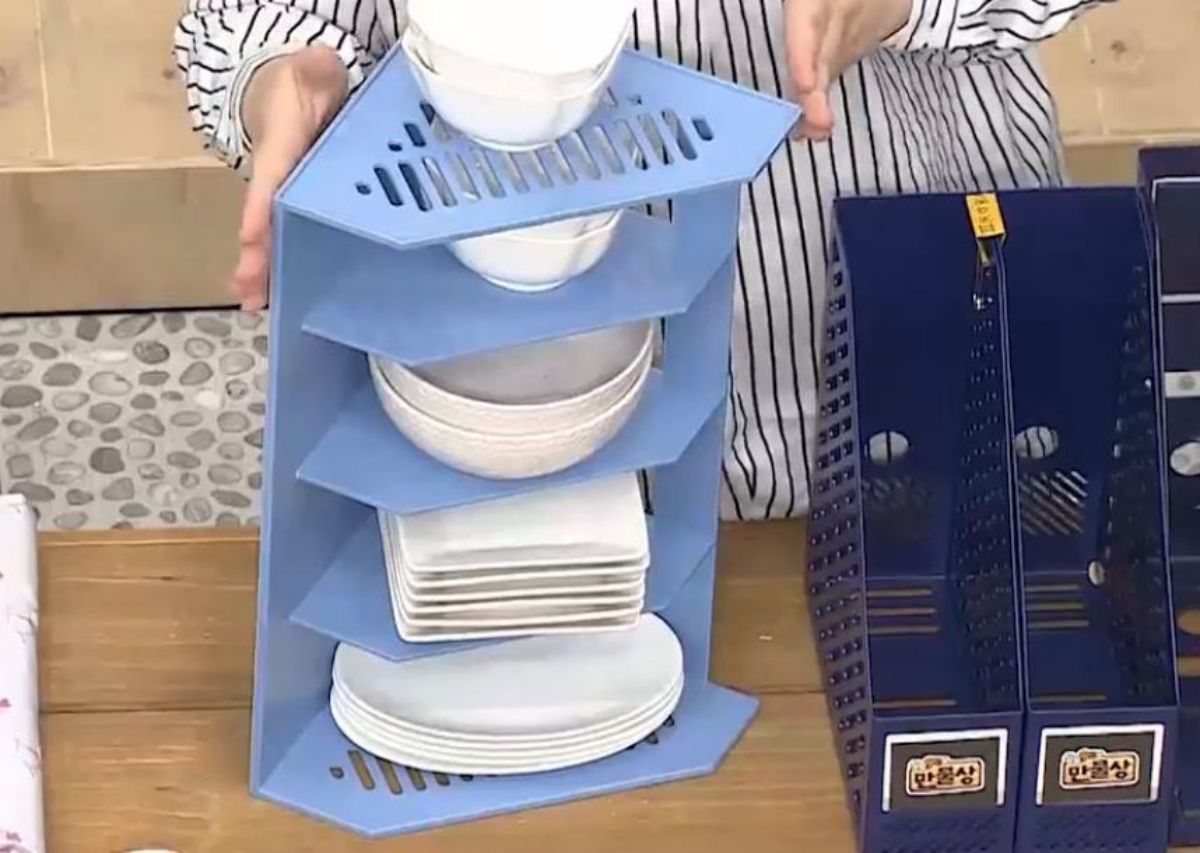 책꽂이를 세워 두거나 눕혀 칸마다 접시를 하나씩 꽂아 넣으면, 접시를 위에서 들어 올릴 필요 없이 옆으로 꺼낼 수 있다. 프라이팬이나 쟁반도 같은 방식으로 정리가 가능하다. 폭이 좁은 책꽂이를 사용할수록 흔들림이 줄어 안정성이 높아진다.
