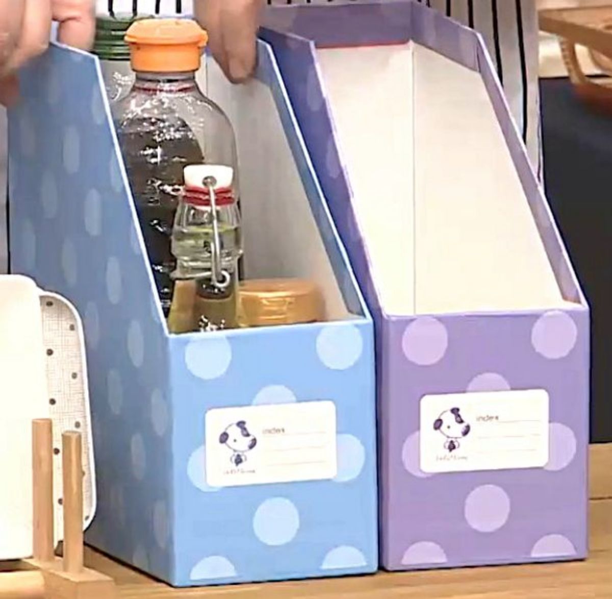 양념통 정리에도 효과적이다. 깊은 상부장에 책꽂이를 눕혀 넣으면 자연스럽게 단차가 생겨 뒤쪽 물건이 가려지는 문제를 줄일 수 있다. 여기에 낮은 받침대를 함께 사용하면 계단식 구조가 만들어져 작은 소금통부터 큰 식용유 병까지 한눈에 구분된다.