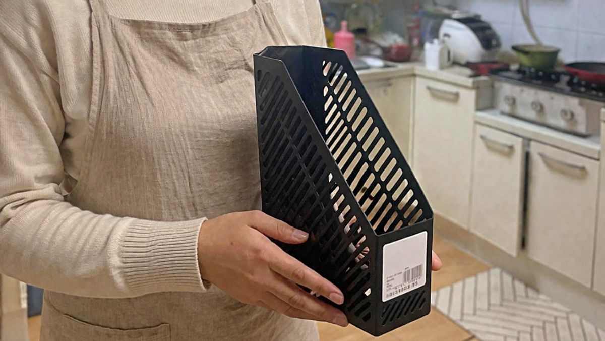 싱크대 아래 공간은 배수관 때문에 구조가 복잡하다. 특히 냄비 뚜껑은 눕혀 두면 공간을 차지하고, 세워 두면 쓰러지기 쉽다. 작은 책꽂이를 문 쪽에 배치하면 뚜껑을 책처럼 꽂아 보관할 수 있다. 필요한 순간 바로 꺼낼 수 있어 조리 중 불필요한 동선을 줄인다.