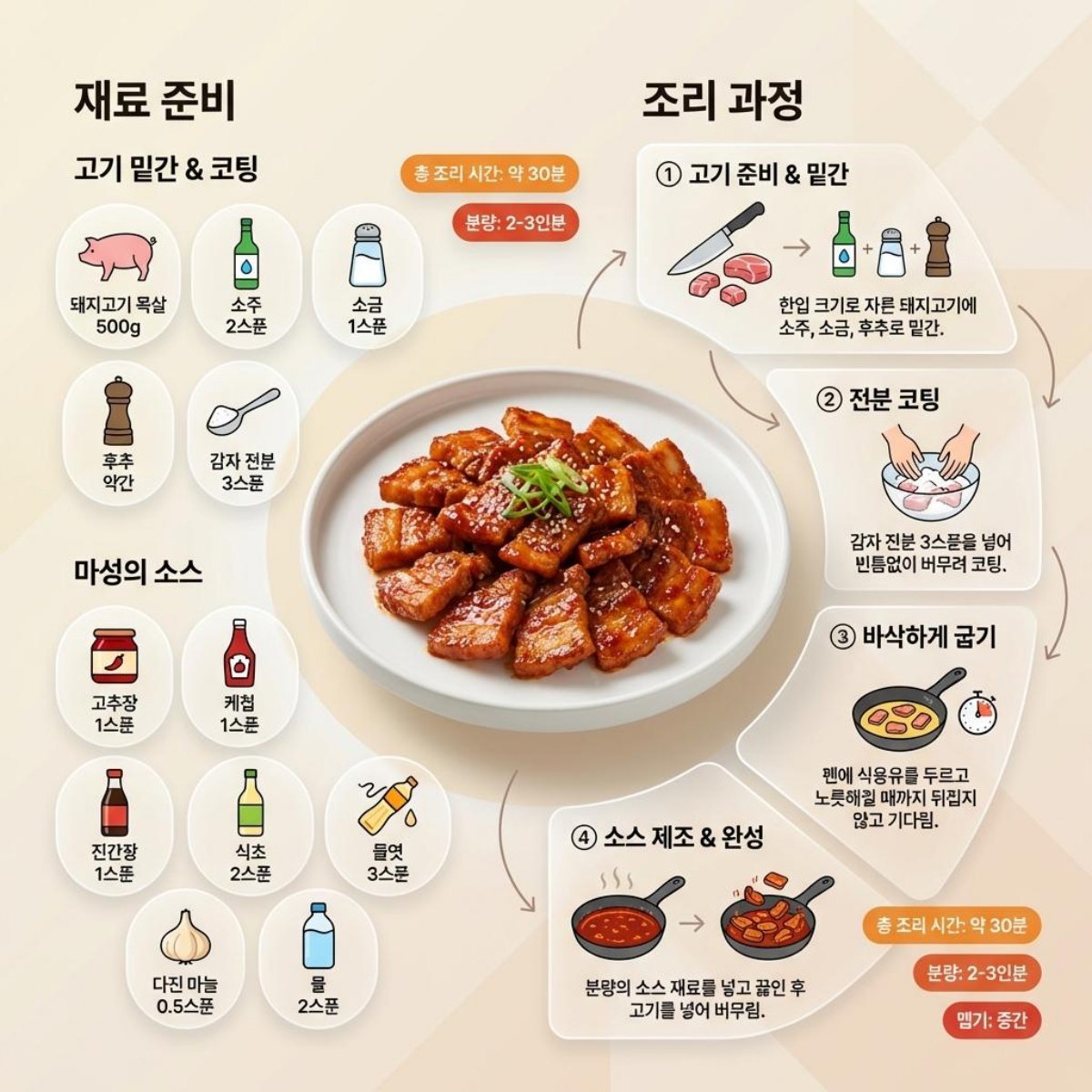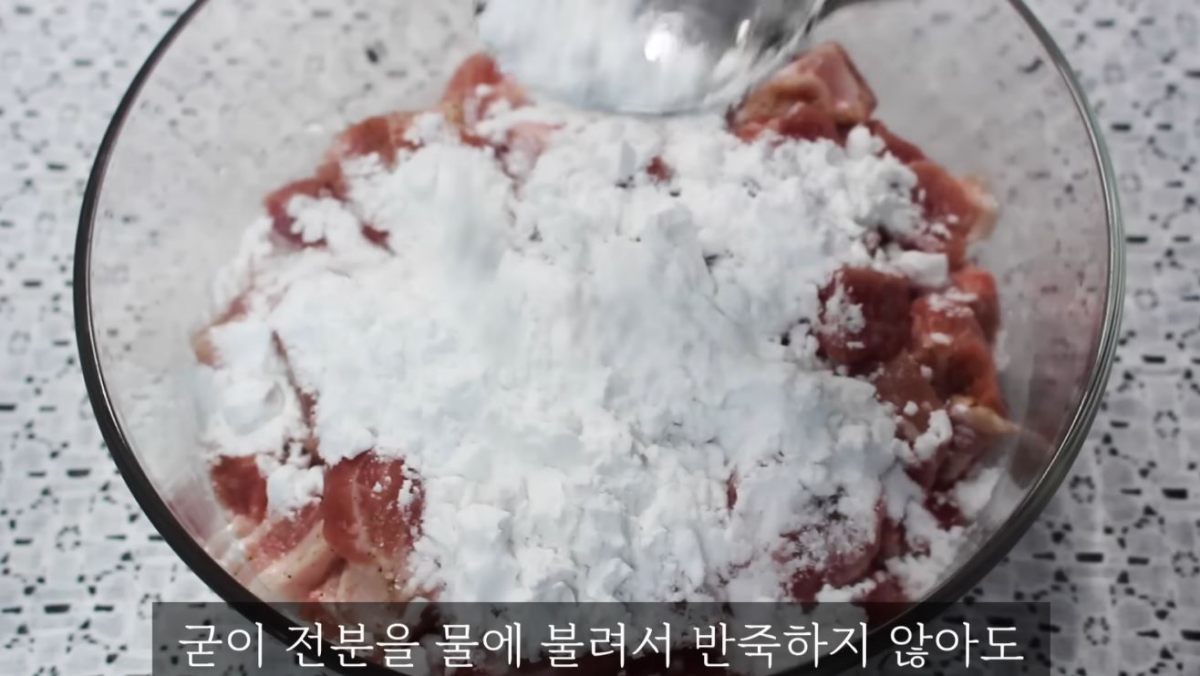 요리의 서막은 돼지고기 목살 500g을 한입 크기로 정갈하게 다듬는 것에서 시작된다. 고기의 잡내를 잡고 깊은 풍미를 더하기 위해 소주 2스푼, 소금 1스푼, 후추 약간을 가미해 세심하게 밑간을 진행한다. 여기에 이 요리의 핵심 기술인 ‘전분 코팅’이 이어진다.