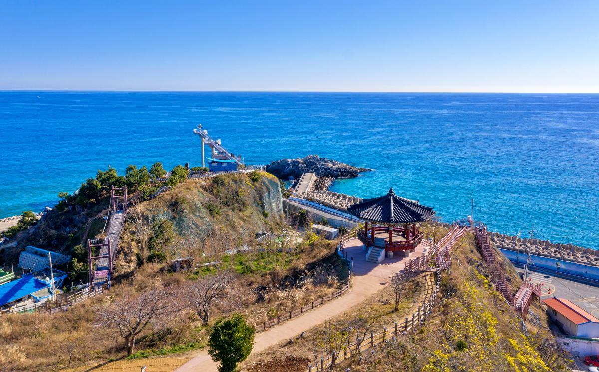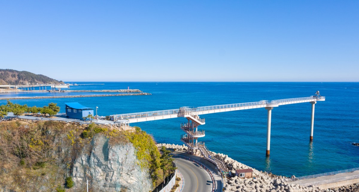 이 같은 풍경의 중심에 있는 곳이 바로 '등기산스카이워크'다. 후포항 뒤편 언덕 끝에서 바다 쪽으로 길게 뻗은 이곳은 높이 20m, 길이 135m 규모로 조성됐으며, 이 가운데 57m가량은 투명 강화유리 바닥으로 꾸며졌다. 발걸음을 옮길 때마다 발 아래로 하얗게 부서지는 파도와 푸른 바다가 그대로 내려다보여 긴장감과 개방감을 함께 느끼게 한다. 시선을 들어 올리면 끝없이 이어지는 수평선이 펼쳐지고, 선묘 낭자 설화와 등대공원 풍경까지 더해져 울진의 바다 정취를 선명하게 보여준다.