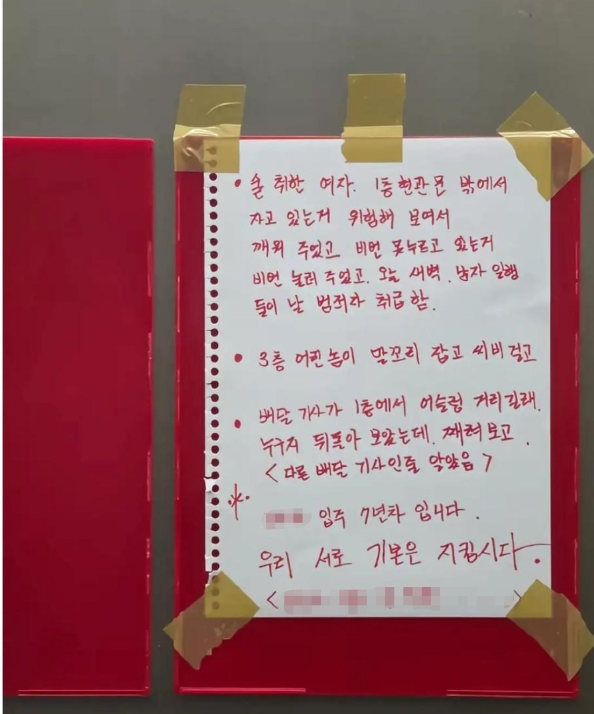 경고문 내용에 따르면 작성자는 며칠 전 새벽 2시가 넘어 담배를 피우러 나갔다가 1층 현관문 밖에 한 여성이 쓰러져 있는 모습을 발견했다. 그는 여성이 현관 밖에서 자고 있어 위험해 보여 깨웠고, 공동현관 비밀번호를 제대로 누르지 못하자 대신 눌러줬다는 취지로 당시 상황을 설명했다.