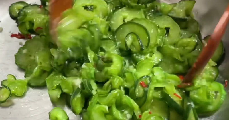 오이가 어느 정도 투명해지면 소금 1/2티스푼과 후추를 넣어 간을 맞춘다. 이미 절임 과정에서 어느 정도 간이 배어 있기 때문에 추가 소금은 최소한으로 사용하는 것이 좋다. 이어서 어슷 썬 홍청양고추를 넣어 색감과 매콤함을 더한다. 고추는 마지막에 넣어야 아삭한 식감과 향을 유지할 수 있다.