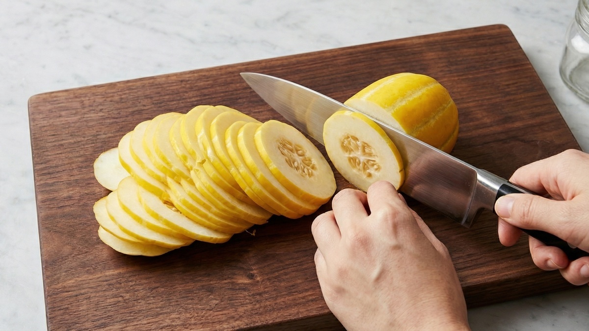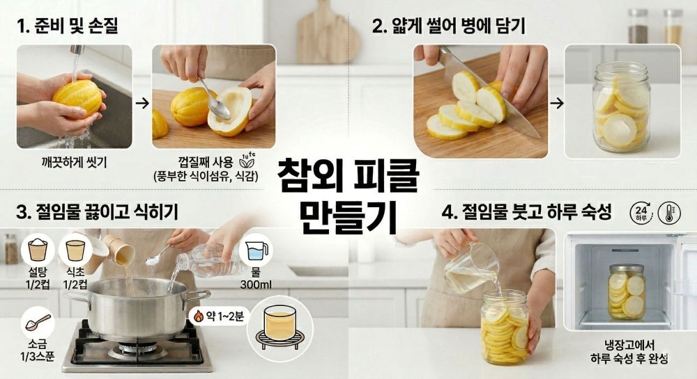 참외 피클을 만드는 과정은 생각보다 간단하다. 먼저 참외를 깨끗이 씻어 준비한다. 껍질째 사용하는 것이 특징인데, 껍질에는 식이섬유가 풍부하고 식감을 살리는 데 도움이 된다. 이후 참외를 반으로 갈라 속에 있는 씨를 깔끔하게 파낸다.