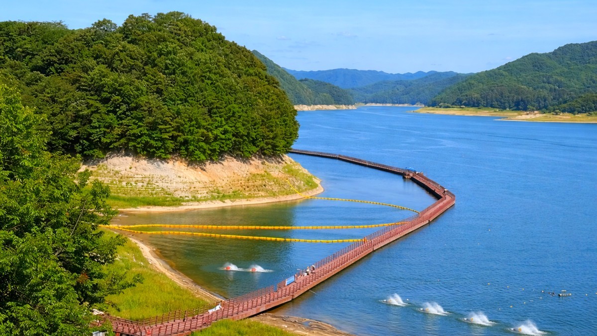 예끼마을의 백미는 단연 안동호 위를 걷는 약 1km 길이의 부교다. 안동호의 수위 변화에 따라 다리 전체가 위아래로 움직이는 부유식 구조로, 걸을 때마다 아주 미세한 출렁임을 느낄 수 있다. 길 중간에는 수몰된 학교의 풍금과 책걸상을 재현해 두었는데, 안개가 낀 날에는 물속에서 학교가 떠오른 듯한 몽환적인 분위기를 자아낸다.
