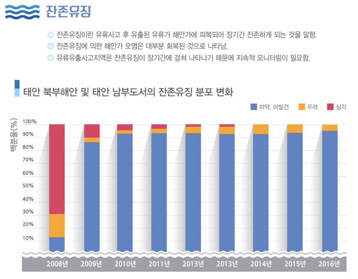 보고서에 따르면 사고 직후 기준치를 크게 웃돌았던 해수 내 기름 성분은 약 1년 안에 빠르게 줄었고, 갯벌과 퇴적물에 남은 유류 오염과 해안가에 남아 있던 기름 흔적은 2~3년에 걸쳐 점차 회복된 것으로 분석됐다.