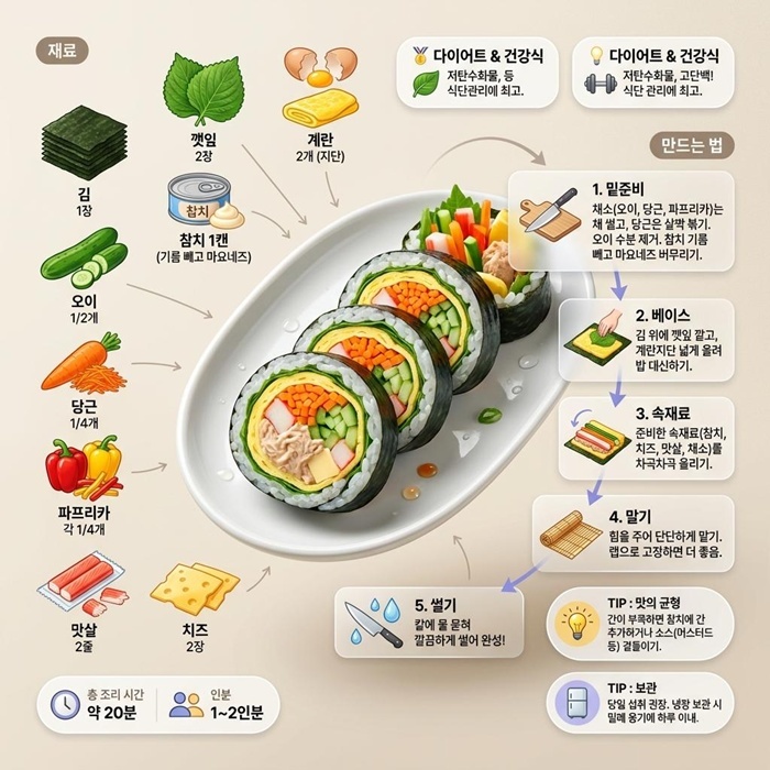 밥 없이도 충분히 만족스러운 한 끼가 가능하다는 점을 보여주는 이 김밥은, 바쁜 일상 속에서 간단하면서도 건강한 식사를 찾는 사람들에게 하나의 대안이 되고 있다. 재료 준비와 조리 과정이 비교적 간단해 요리에 익숙하지 않은 사람도 쉽게 도전할 수 있고, 가족이나 아이들과 함께 만들기에도 부담이 없다.