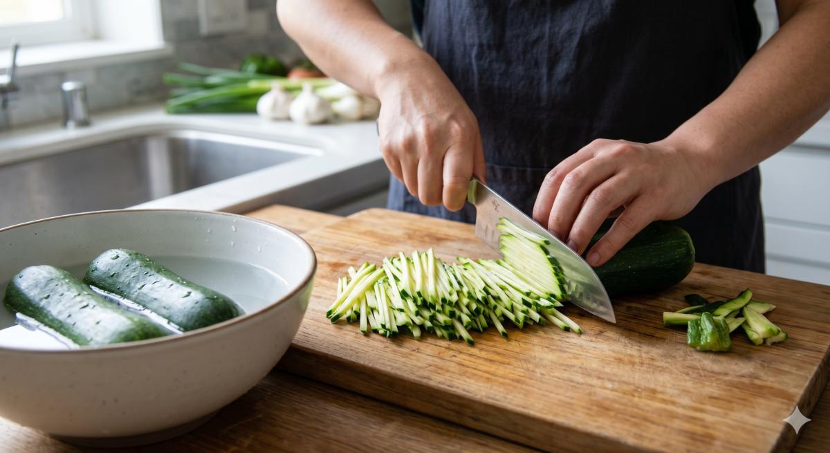 애호박은 깨끗하게 씻어 양끝을 잘라낸 뒤 일정한 두께로 채를 썬다. 너무 얇게 썰면 씹는 맛이 줄어들고 너무 두꺼우면 익는 데 시간이 오래 걸려 눅눅해질 수 있다. 약 0.3센티미터 정도가 적당하다. 채를 썬 애호박을 넓은 그릇에 담고 소금을 살짝 뿌려 절여준다. 약 10분 정도 그대로 두면 애호박에서 물이 조금씩 빠져나온다.