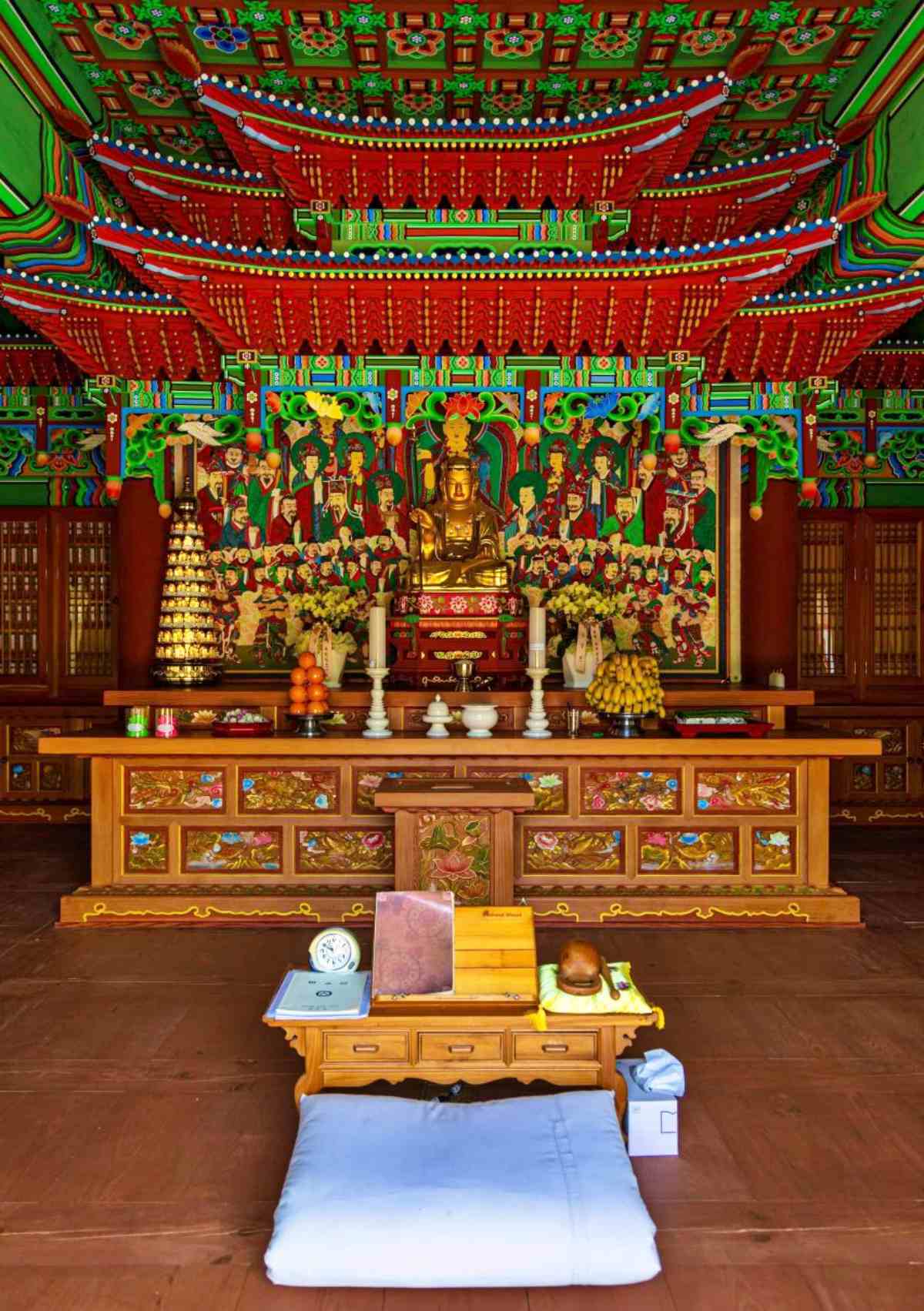 봉황문 뒤로 이어지는 흥화루 역시 눈여겨볼 만하다. 정면 3칸, 측면 2칸 규모의 주심포 맞배지붕 건물로, 수타사 경내 진입부에 놓인 누각이다. 이곳에는 목어와 법고가 보관돼 있다. 특히 목어의 모습이 인상적이다. 흔히 용의 머리 형태를 취하는 경우가 많지만, 수타사의 목어는 물고기 형상에 가깝고 여의주를 물고 있다. 돼지 코를 닮은 코 모양과 여덟 개의 이빨을 드러낸 표정에는 해학적인 분위기도 담겨 있다. 법고는 암소와 수소의 가죽을 양면에 대어 소리의 조화를 꾀했고, 나무 몸통에는 용 그림이 화려하게 그려져 있다. 이런 요소들은 사찰 건축이 예배 공간을 넘어 공예와 조형의 성격까지 함께 품고 있음을 보여준다.