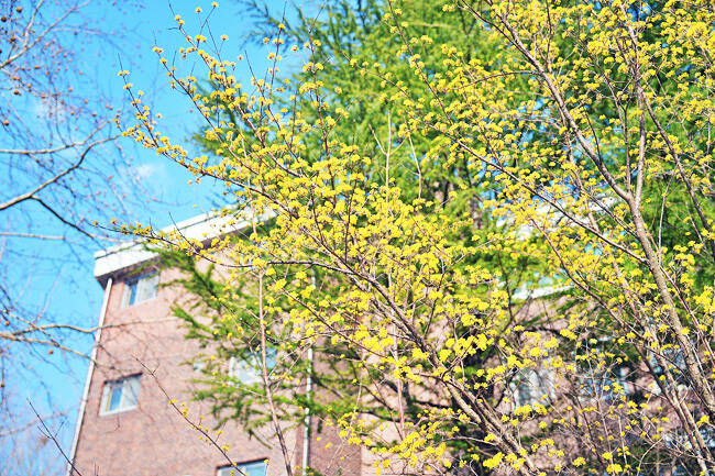 2일 교내 곳곳에는 벚꽃과 산수유가 만개해 장관을 이루며, 학생들과 지역민들에게 여유로운 휴식 공간을 제공하고 있다.