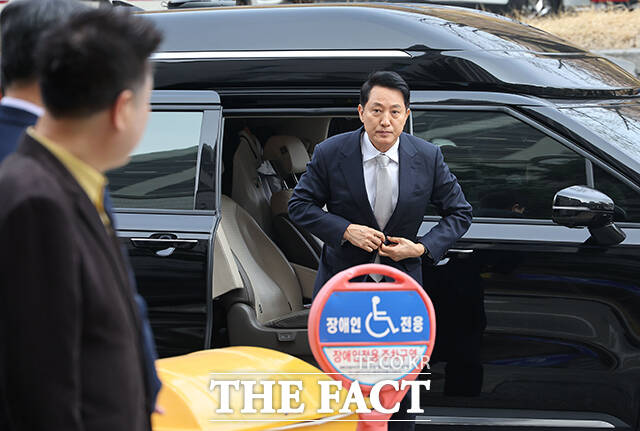 [더팩트ㅣ남윤호 기자] 오세훈 서울시장이 3일 오전 서울 서초구 서울중앙지방법원에서 열린 여론조사비 대납 의혹 관련 5차 공판에 출석하고 있다. 오른쪽은 이날 증인으로 공판에 출석하는 '정치 브로커' 명태균 씨의 모습.