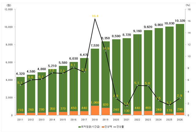 최근 10년간 최저임금 인상률은 2016년 8.1%(6030원), 2017년 7.3%(6470원), 2018년 16.4%(7530원), 2019년 10.9%(8350원) 등으로 큰 폭으로 올랐다. 이후부터는 2020년 2.9%(8590원), 2021년 1.5%(8720원), 2022년 5%(9160원), 2023년 5%(9620원), 2024년 2.5%(9860원), 2025년 1.7%(1만30원), 2026년 2.9%(1만320원) 수준으로 비교적 낮은 인상률에 머물렀다.