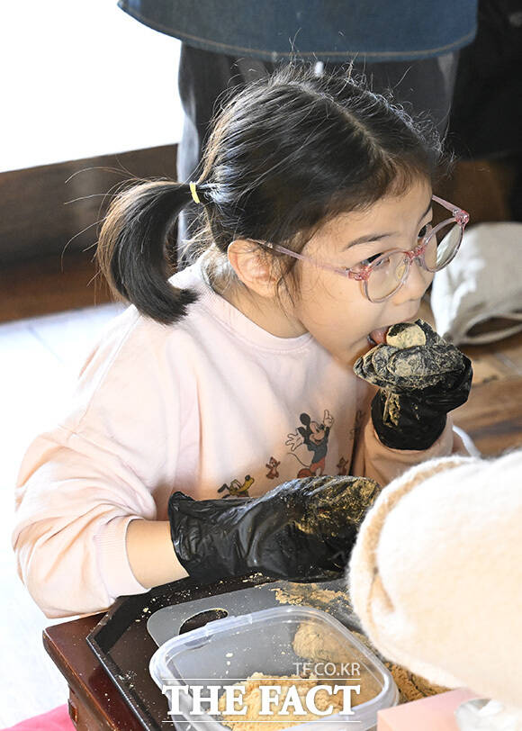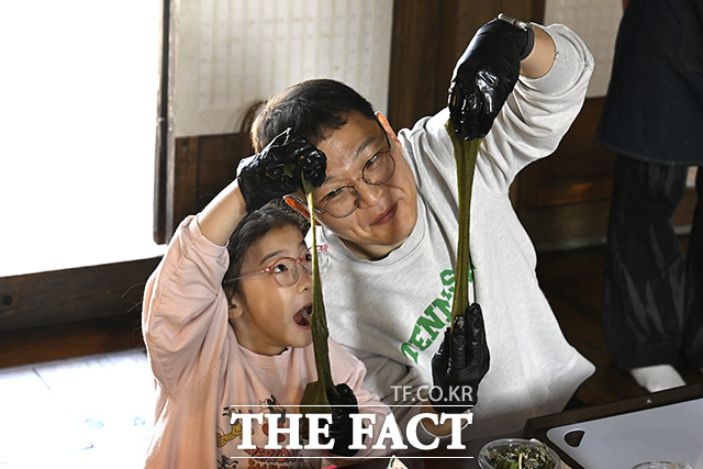 [더팩트 | 송호영 기자] 절기상 한식을 앞둔 4일 오전 서울 중구 남산골한옥마을을 찾은 부녀가 쑥 디저트 만들기 체험을 하고 있다.