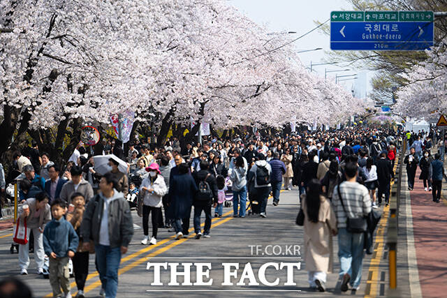 [더팩트ㅣ박헌우 기자] 5일 오후 서울 여의도 윤중로가 '여의도 봄꽃축제'를 찾은 시민들로 북적이고 있다.