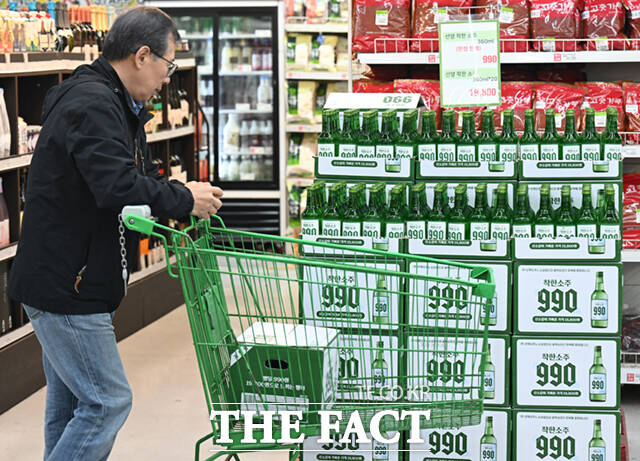 [더팩트ㅣ이새롬 기자] 충청권 대표 주류기업 선양소주가 병당 990원인 '착한소주 990'을 선보인 가운데, 6일 서울 송파구 가락몰 다농마트를 찾은 소비자들이 제품을 구매하고 있다.