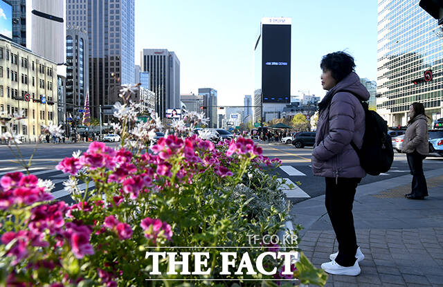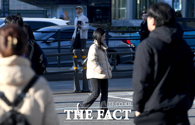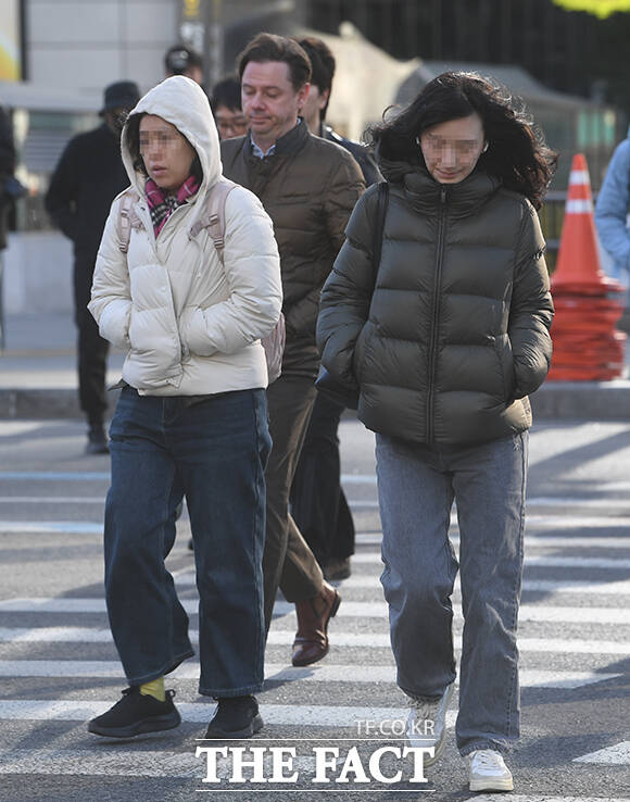 [더팩트 | 박상민 기자] 아침 기온이 5~10도가량 큰 폭으로 떨어진 7일 오전 서울 종로구 광화문 네거리에서 시민들이 두터운 외투를 입고 출근하고 있다.