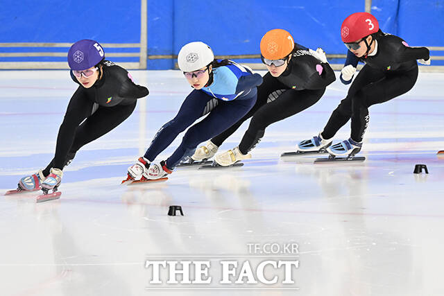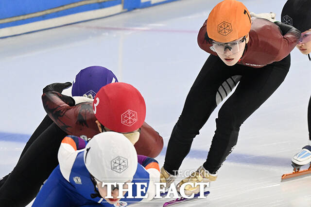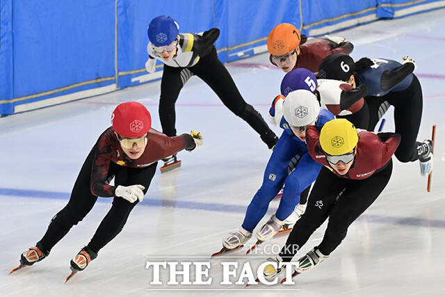[더팩트 | 김성렬 기자] 쇼트트랙 김혜빈(빨강)이 7일 오후 서울 양천구 목동실내빙상장에서 열린 '2026-2027 쇼트트랙 국가대표 선발전' 여자 1500m 결승에서 추월 시도를 하고 있다.