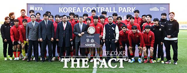 [더팩트ㅣ천안=남윤호 기자] 7일 오후 천안 서북면 코리아풋볼파크에서 개관 기념 경기로 열린 '코리아풋볼파크 U-18 챔피언스 컵' 시상식에서 정몽규 대한축구협회장이 우승팀인 서울오산고 선수들과 기념촬영을 하고 있다.