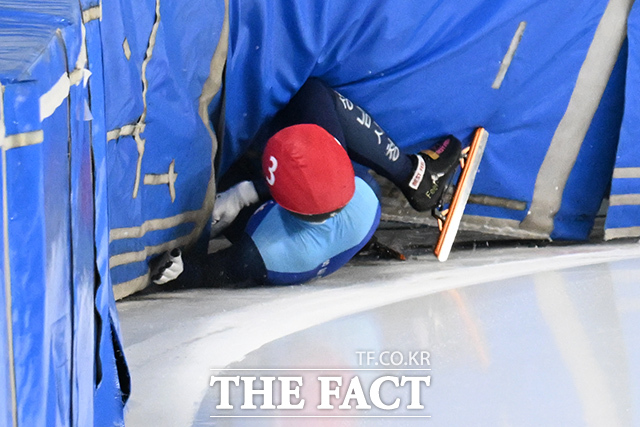 [더팩트 | 김성렬 기자] 쇼트트랙 선수 서범석(성남시청)이 8일 오후 서울 양천구 목동실내빙상장에서 열린 '2026-2027 쇼트트랙 국가대표 1차 선발대회' 남자 500m 예선에서 경기중 넘어져 펜스에 부딪히고 있다. ksr@tf.co.kr사진영상기획부 photo@tf.co.kr