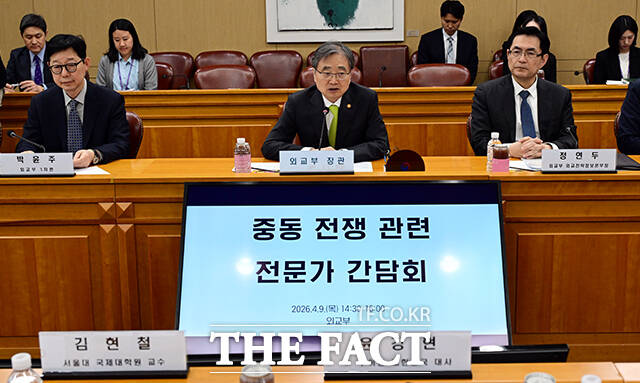 [더팩트ㅣ임영무 기자] 조현 외교부 장관(가운데)이 9일 오후 서울 종로구 외교부에서 열린 중동 전쟁 관련 전문가 간담회에 참석해 모두발언을 하고 있다. darkroom@tf.co.kr사진영상기획부 photo@tf.co.kr