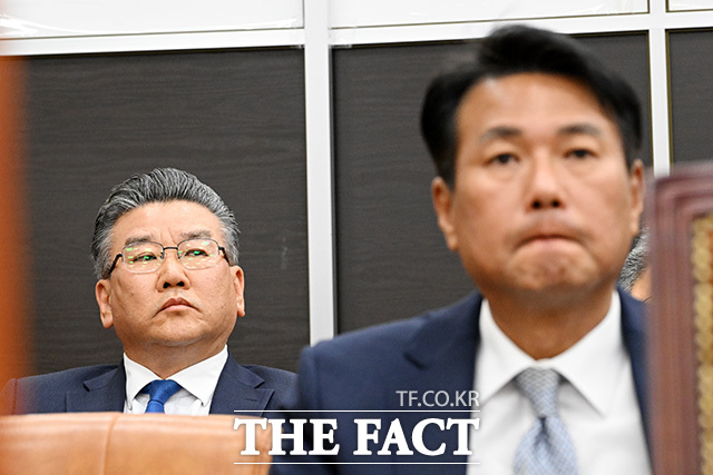 [더팩트ㅣ국회=남용희 기자] 유병호 감사원 감사위원(왼쪽)과 김태효 전 국가안보실 제1차장이 21일 오후 서울 여의도 국회에서 열린 윤석열 정권 정치검찰 조작 기소 의혹 사건 진상규명 국정조사특별위원회에서 열린 서해 공무원 피격·통계조작·’윤석열 명예훼손’ 허위보도 조작기소 의혹 사건에 대한 청문회에 증인으로 출석해 의원 질의를 듣고 있다.