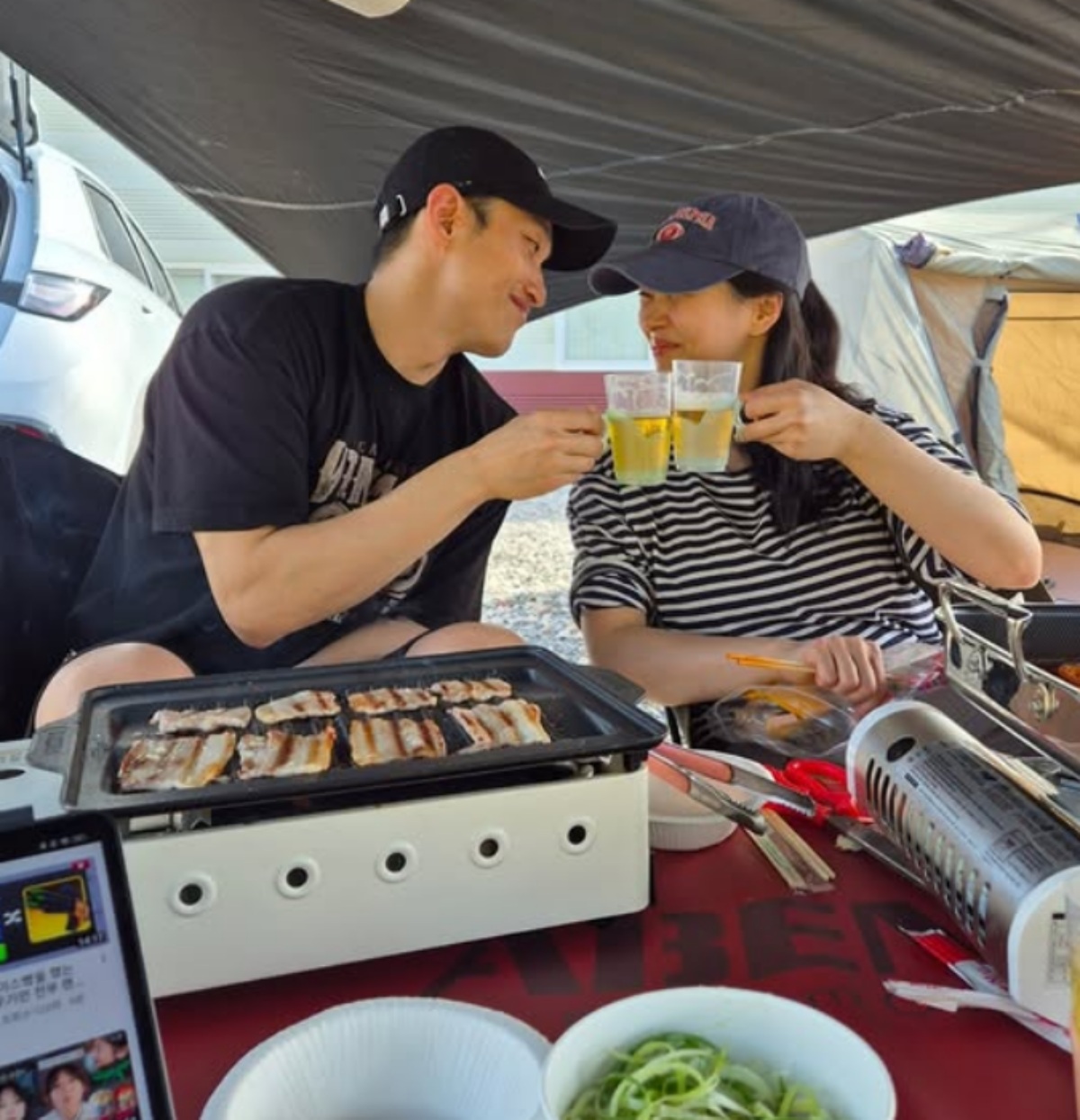 사진 속 유현철과 김슬기는 캠핑장에서 삼겹살을 구워 먹으며 여유를 즐기고 있다.