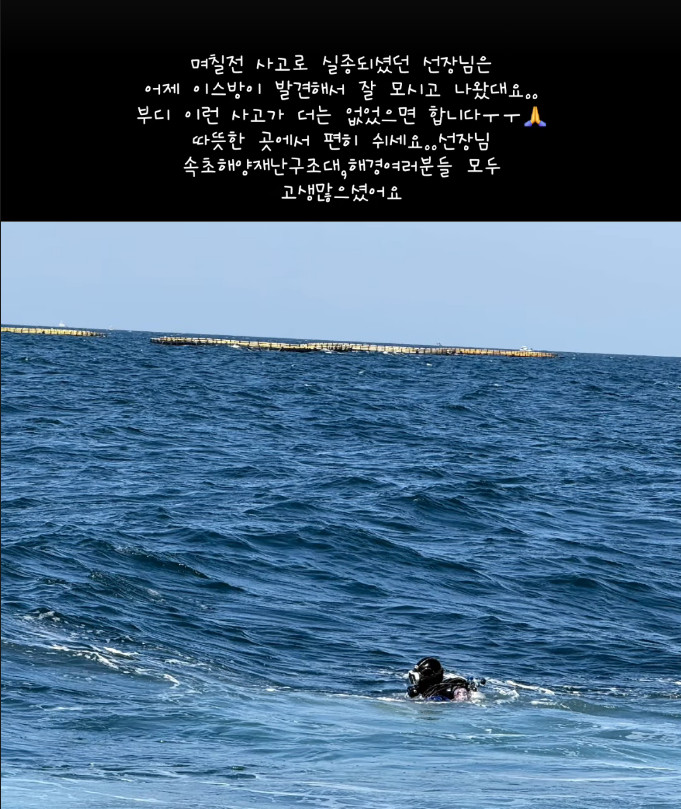 (엑스포츠뉴스 황수연 기자) 강원 속초 앞바다에서 어선 전복 사고로 실종된 70대 선장이 수색 이틀 만에 숨진 채 발견된 가운데, 이를 찾은 민간 잠수사가 하재숙의 남편 이준행 씨로 밝혀졌다.