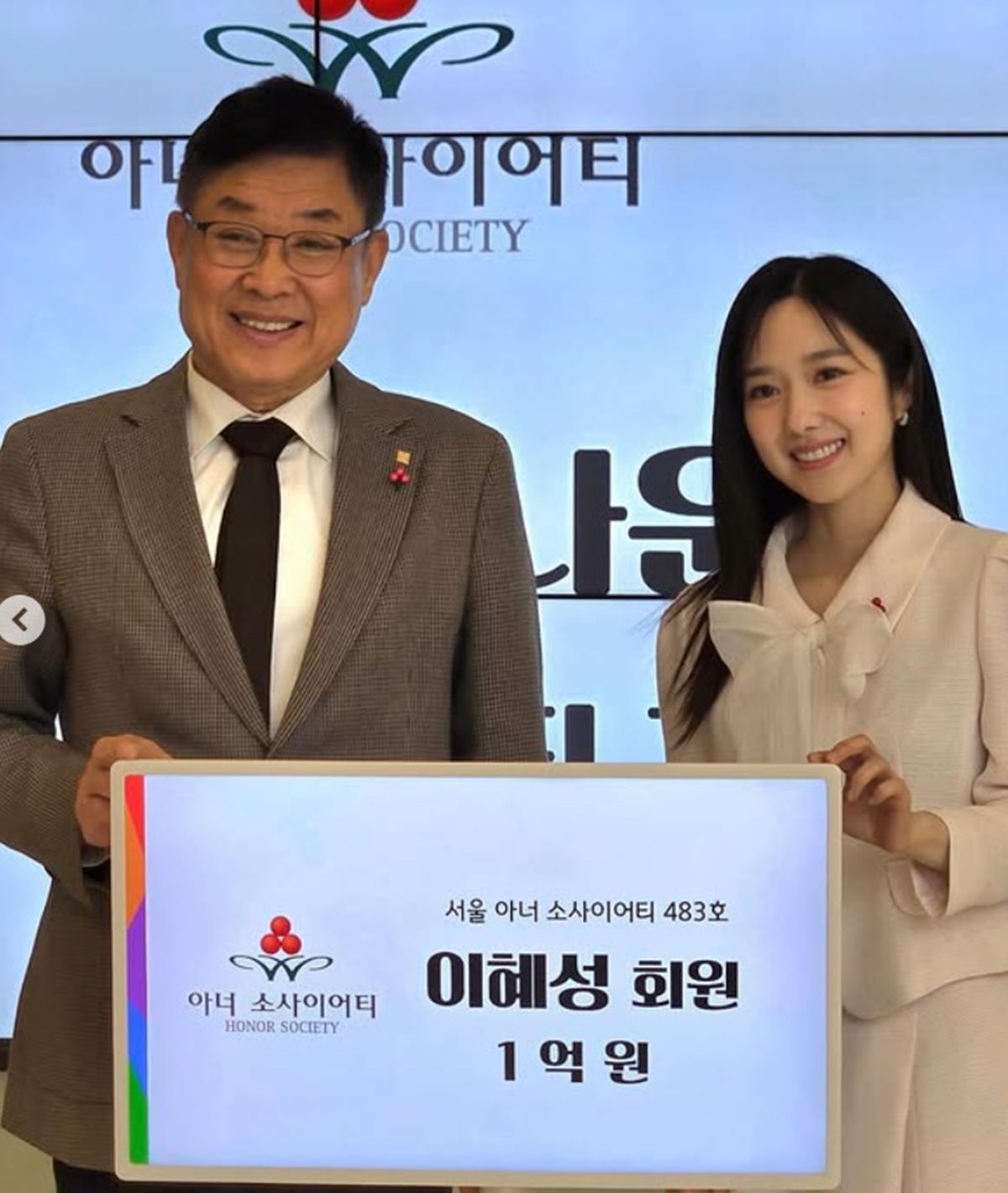 이혜성은 “서울에서 483번째로 아너 소사이어티 회원이 됐다”며 “제 명의의 집도 없는 제가 이런 기부에 동참하는 게 가당치 않을 수도 있지만, 나눔에 TPO가 따로 있을까 싶었다”고 밝혔다.