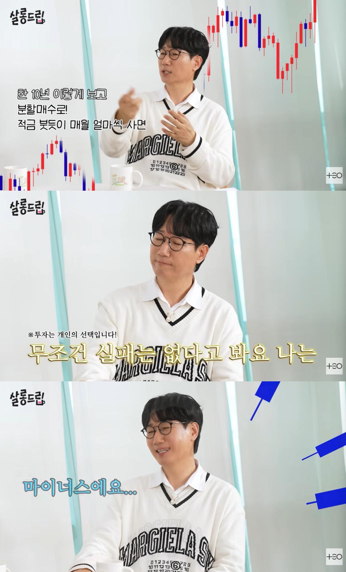 지석진은 "실패가 없으려면 ETF를 장기간 보고 10년을 봐야 한다. 분할 매수로 적금처럼 매월 사면 무조건 실패는 없다고 본다"고 확신에 찬 조언을 했다.