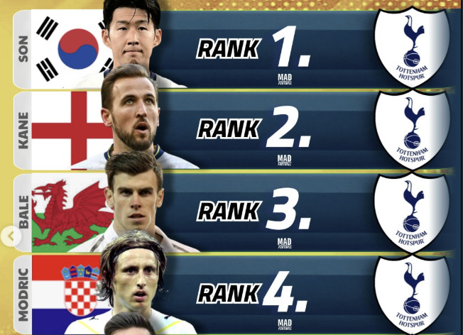 3~4위엔 토트넘에서 대성해 세계 최고 명문 레알 마드리드로 이적한 선수들이 나란히 등장했다. 2018 러시아 월드컵 MVP 루카 모드리치(크로아티아)가 4위, 유럽 축구에서 많은 팬을 확보하고 있는 베일(웨일스)가 3위에 올랐다.