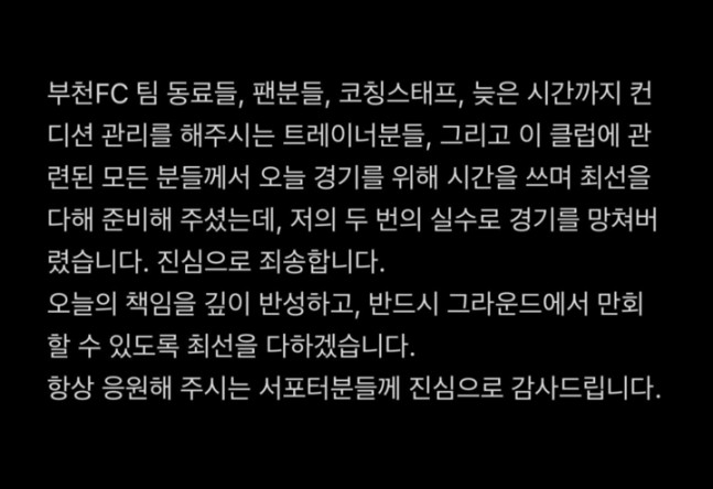 그는 "부천FC 팀 동료들, 팬분들, 코칭스태프, 늦은 시간까지 컨디션 관리를 해주시는 트레이너분들, 그리고 이 클럽에 관련된 모든 분들께서 오늘 경기를 위해 시간을 쓰며 최선을 다해 준비해 주셨는데, 저의 두 번의 실수로 경기를 망쳐버렸습니다. 진심으로 죄송합니다"라며 고개를 숙였다.