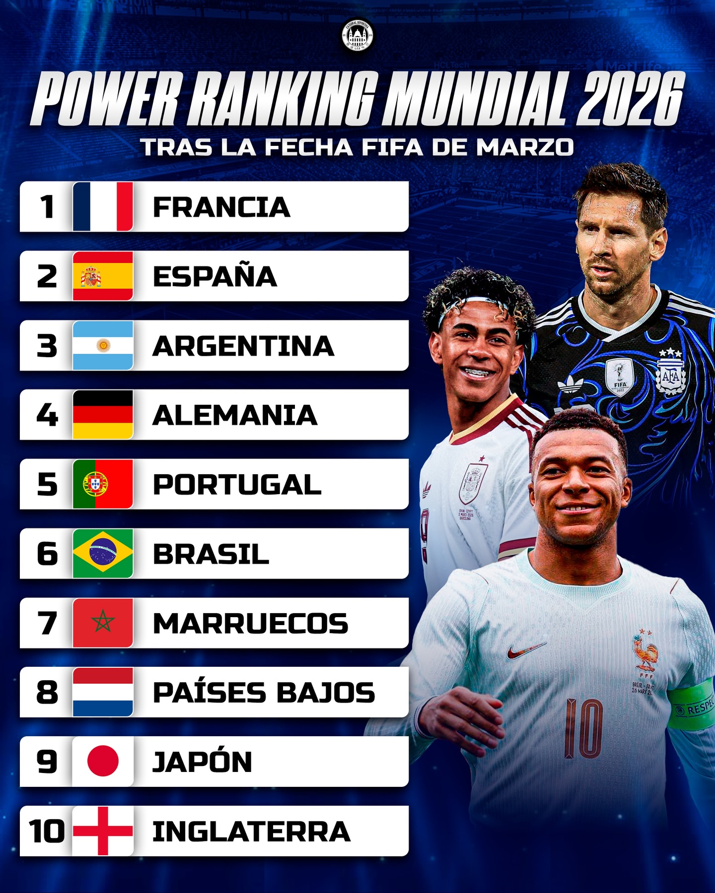 라틴아메리카 지역 스포츠 매체 '카테드랄 데포르티바'가 지난 2일(한국시간) 인스타그램을 통해 3월 A매치 이후 2026 국제축구연맹(FIFA) 북중미 월드컵(캐나다·미국·멕시코 공동개최) 파워 랭킹 상위 10위를 공개했다.