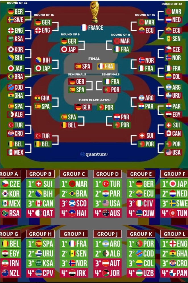 이번 북중미 월드컵은 참가국이 32개국에서 48개국으로 늘어남에 따라 조별리그가 12개 조로 구성됐고, 토너먼트도 기존의 16강이 아닌 32강부터 시작한다. 각 조의 1~2위를 차지한 24개국과 조 3위를 차지한 국가들 중 성적이 가장 좋은 8개국이 32강 토너먼트에 진출한다.