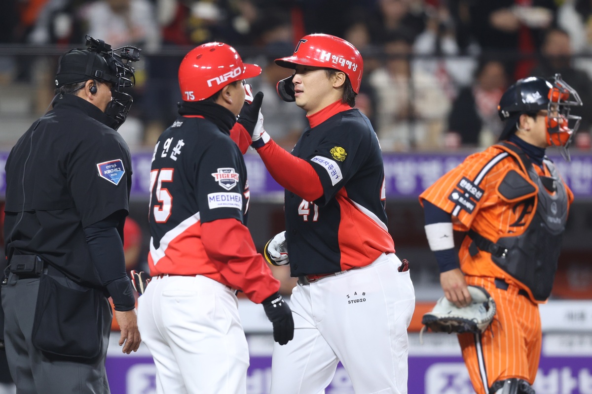 KIA도 가만히 있지 않았다. KIA는 8회초 1사 뒤 김도영이 바뀐 투수 김종수의 2구째 134km/h 슬라이더를 통타해 비거리 130m짜리 대형 좌월 솔로 아치를 그려 다시 도망갔다.