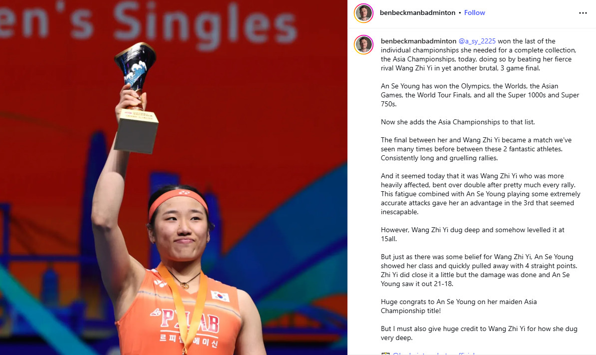 이어 "결국 안세영이 21-18로 경기를 마무리했다"며 "첫 아시아선수권 우승을 차지한 안세영에게 축하를 보낸다"고 전했다.