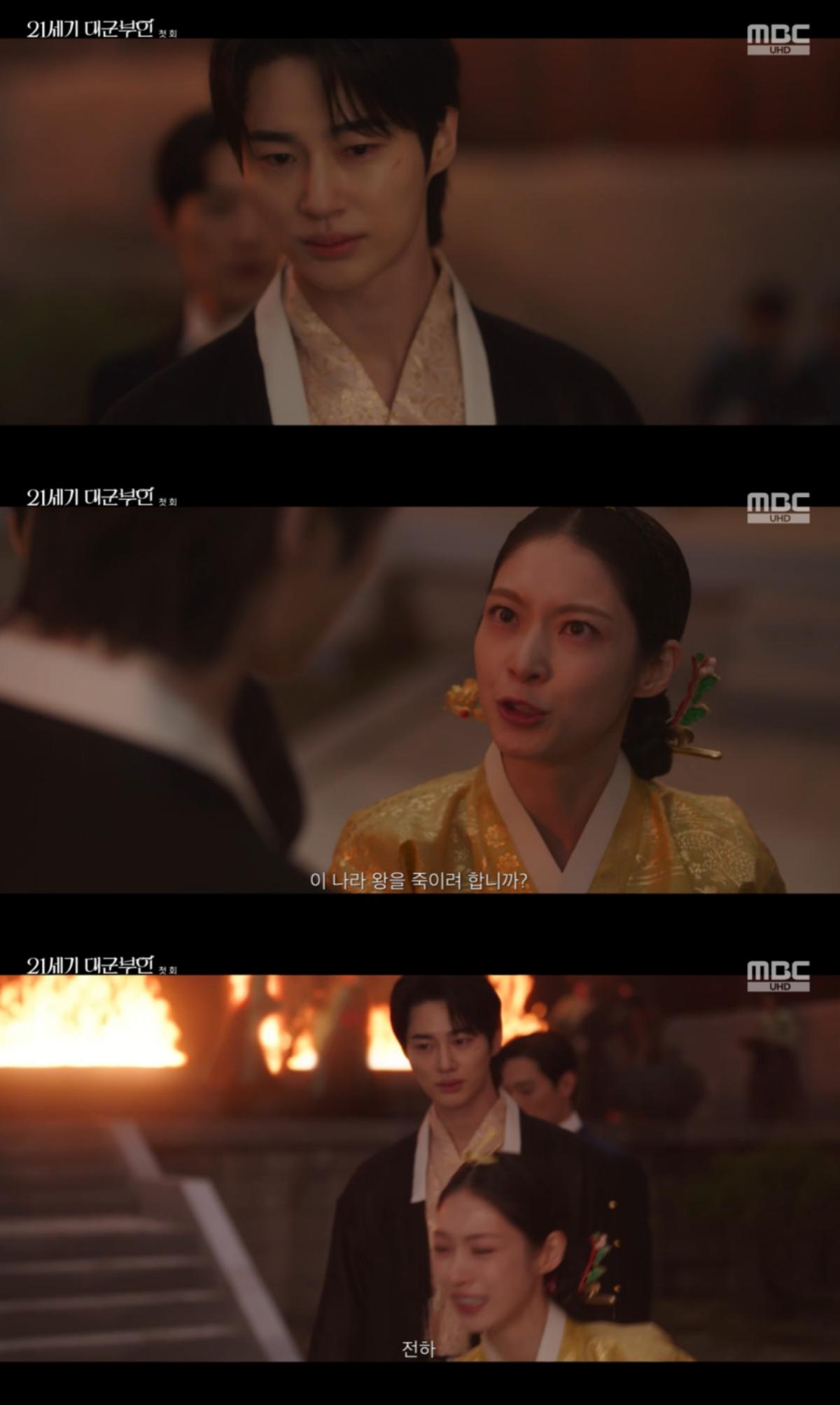 이안대군이 불이 난 궁을 지켜보며 "전하께선?"이라고 묻는 순간, 대비마마 윤이랑(공승연)이 달려와 이안대군의 뺨을 때렸다.