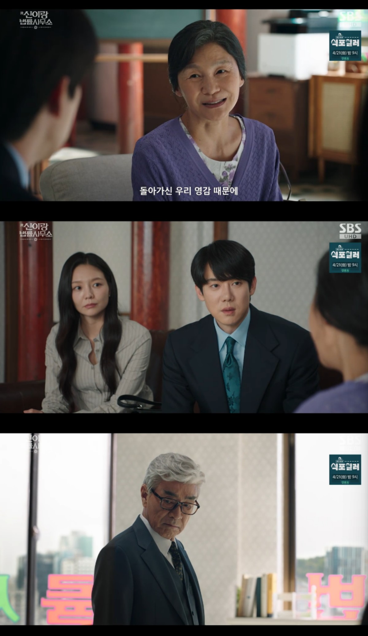 이날 방송에서 신이랑과 친한 채소 가게 할머니 채정희(길해연)이 죽은 남편 강동식(이덕화) 때문에 법률사무소를 찾았다.