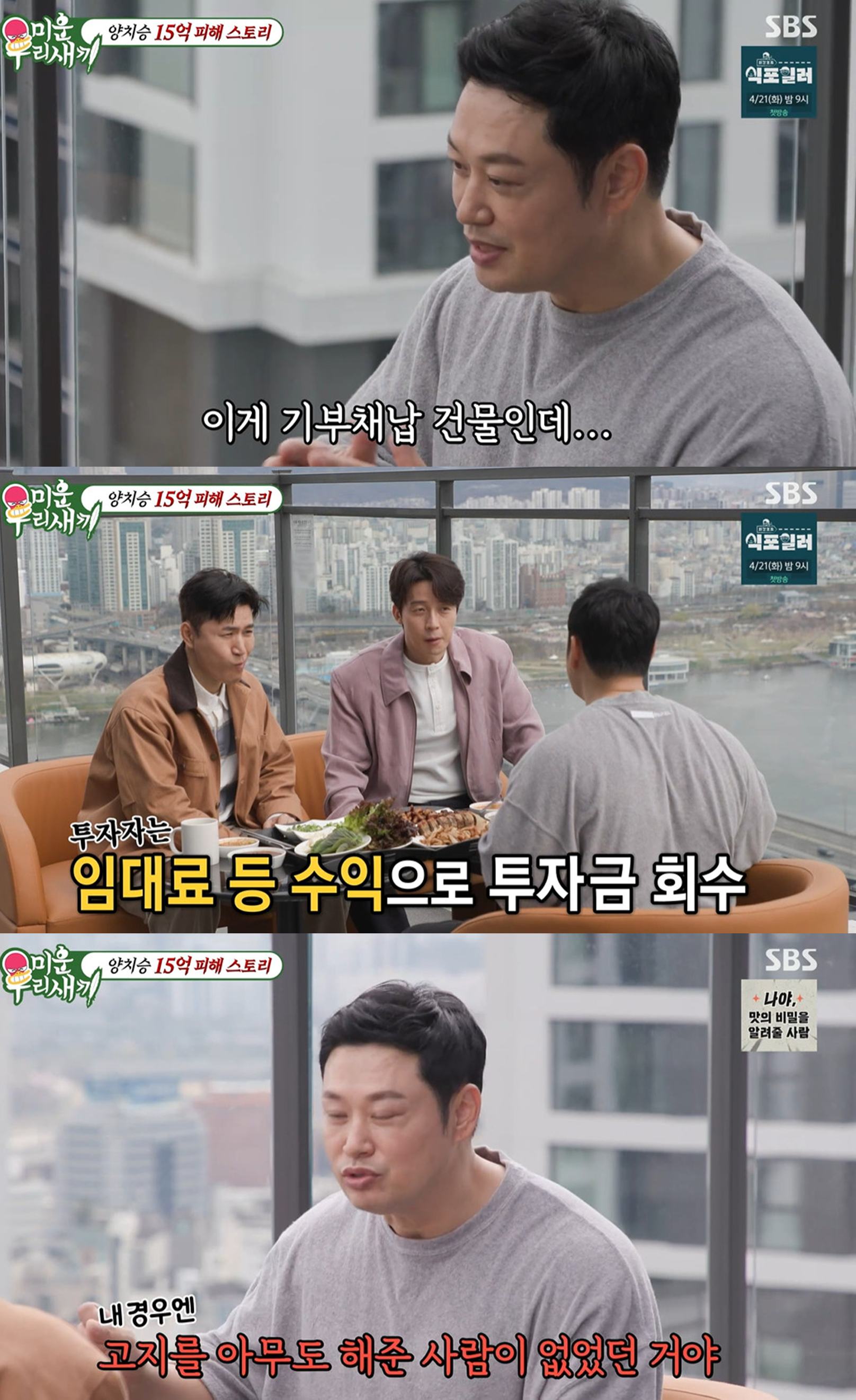 19일 방송된 SBS '미운 우리 새끼'에서는 김종민과 허경환이 헬스트레이너에서 아파트 경비원으로 전향한 양치승과 만나는 모습이 그려졌다.