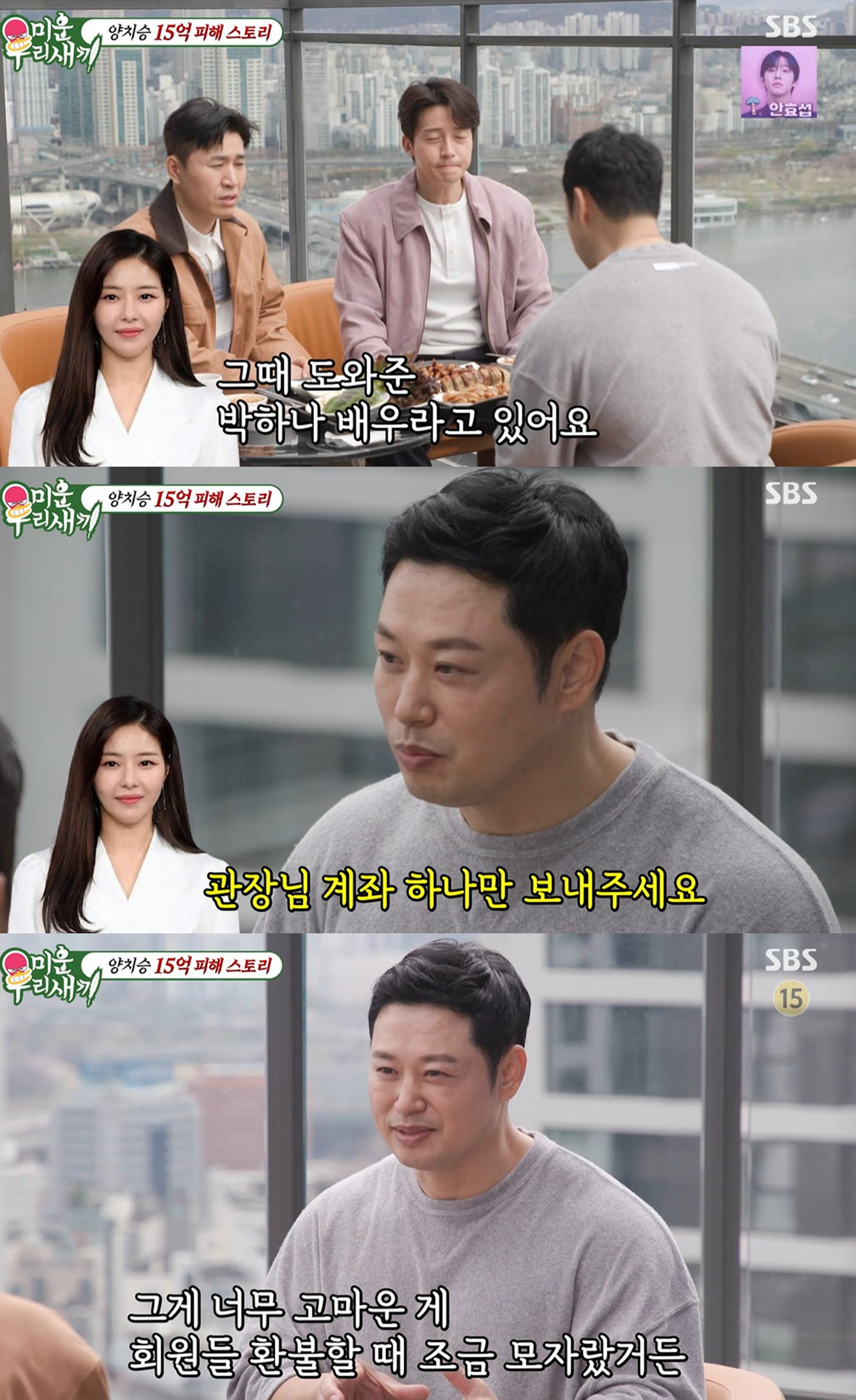 이날 양치승은 15억 사기 피해액에 대해 "방송에서는 15억이라고 했지만, 권리금도 못 받고 회원들 환불해주고 변호사비까지 포함한 금액"이라며 "몇 년 동안 매출이 떨어진 것까지 합치면 더 된다"고 털어놨다.