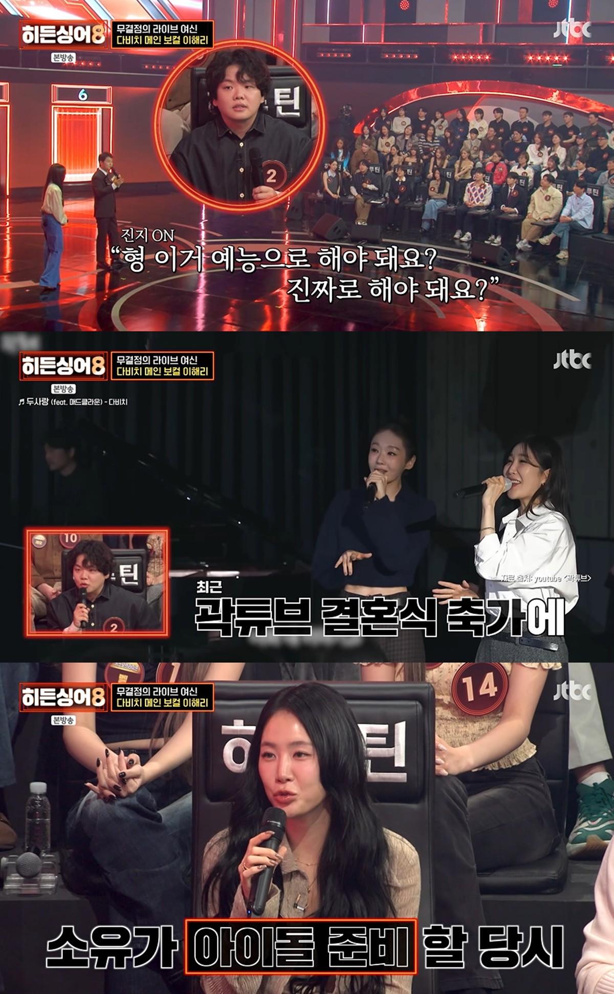 이후 다른 패널들의 샤라웃이 계속됐다. 소유 역시 "아이돌 준비 당시 다비치가 내 우상이었다. 다비치 선배님들 노래를 되게 많이 들었고 되게 많이 불렀다. 어렸을 때와 현재의 목소리를 다 기억하고 있기 때문에 나는 자신 있다"며 자신만만하는 모습을 보였다.