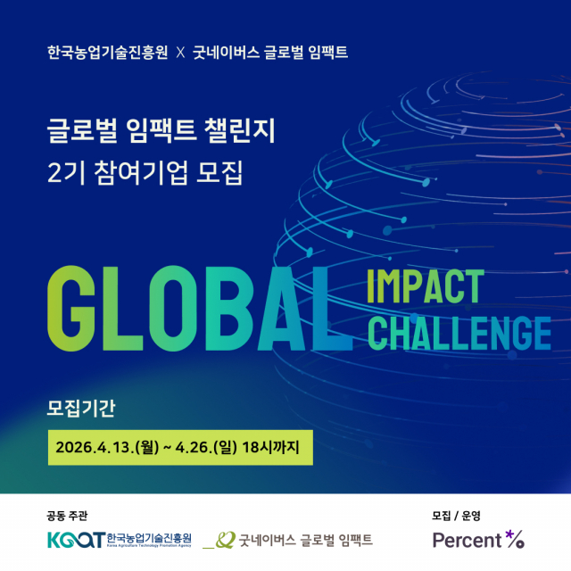 ‘글로벌 임팩트 챌린지 2기 (https://www.a-startups.or.kr/planweb/board/view.9is?dataUid=4028b20297cfefa7019d60630c17483e&contentUid=ba6550717457c60f017467581afb000f&boardUid=ba6550717457c60f01747698c25f0569)’ 모집 요강과 세부 내용은 굿네이버스 글로벌 임팩트 홈페이지와 농진원 농식품창업정보망에서 확인할 수 있다. 프로그램 모집과 운영은 사회문제 해결형 비즈니스와 ESG 분야 스타트업 대상 기술창업 교육을 수행해 온 퍼센트가 담당한다.
