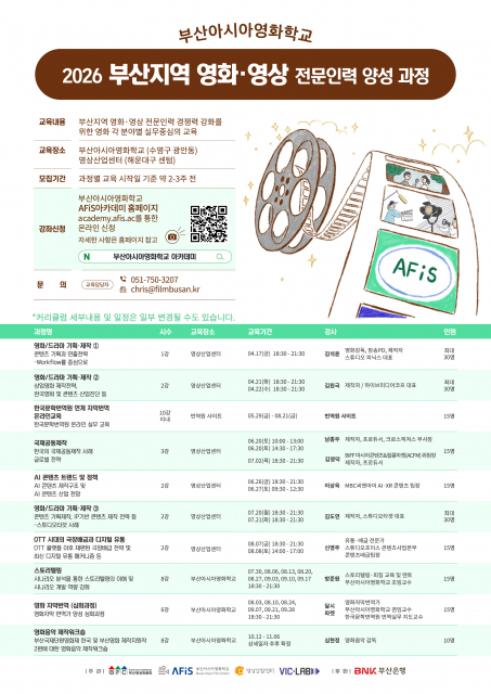 부산영상위원회(운영위원장 강성규)가 운영하는 부산아시아영화학교(Busan Asian Film School, AFiS)는 ‘2026 부산지역 영화·영상 전문인력 양성과정’의 일환으로 드라마 ‘나의 해방일지’의 김석윤 감독과 영화 ‘서울의 봄’의 김원국 하이브미디어코프 대표를 초청해 ‘영화/드라마 기획·제작’ 마스터클래스를 4월 중순 영상산업센터에서 개최한다.
